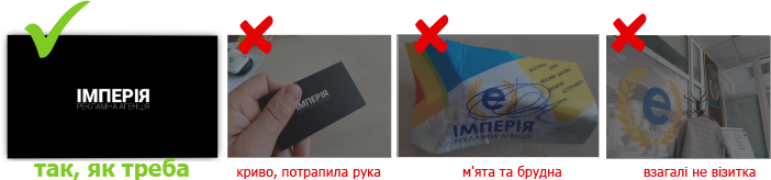 ЗАБОРОНЕНО додавати: фотографії речей, товару, не візитки, пом'яті візитки, візитки в руках або не обрізані картинки. Якщо у вас немає візитки, ми допоможемо її зробити.